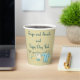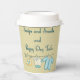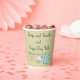 These adorable party paper cups are perfect for your baby shower. It has the well known verse "Snips and Snails and Puppy Dog Tails" written on it in a faux embroidery style font. Below it is a little clothesline with sweet baby boy clothes hanging against a yellow with white polka dots background. The design is repeated on both sides and there is a background of yellow with white polka dots.