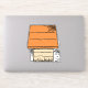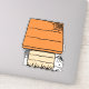 This Peanuts design depicts Snoopy, resting partially inside his iconic doghouse, which has been decorated for Halloween. The roof of the doghouse is painted a vibrant orange, and there are spooky cobwebs adorning the corners both on the roof and on the walls, adding to the eerie, festive atmosphere. Snoopy, peeking out from the bottom right, seems to be keeping watch with a calm, almost sleepy expression, adding a sense of quiet Halloween charm to the scene.