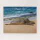 A photo of a peaceful scene of a Hawaiian Green Sea Turtle sprawled out on the sandy beach, living the "Beach Life" at Laniakea Beach, O'ahu.