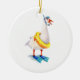 Watercolor painting of White Goose in flippers with swim goggles and snorkelling mask.