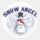 Snowman making a snow angel in the snow. Blue text Snow Angel.