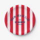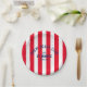 Snow Beach Club Red Cabana Stripe Custom winter paper plate. Personalise with the year of your trip, resort name and location. Perfect for a group destination ski trip or for a ski or snow theme bachelor or bachelorette party. Designed to match our Snow Beach Club Red Cabana Stripe Collection.