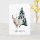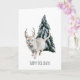 A pale cat with blue eyes and antlers stands in front of a snowy tree on this Happy Holidays card.