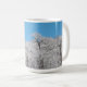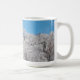 A light snowfall has left a white coating on a hillside of trees. The blue sky adds a distinct contrast to the scene.