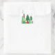 Pretty snow covered Christmas trees and stacks of colorful presents accent this holiday gift tag.
