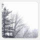 In the horizontal black and white photo of snow-covered trees, two evergreens on the left edge of the frame overlook several shorter barren deciduous trees, all covered with snow. The sky above them is white.