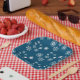 Little white snowflakes on a foggy-day blue gradient background or a deep evening blue, your choice.  Stylish service with the welcome convenience of disposable paper for your holiday feast.