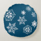This fluffy round throw pillow has two looks--little white snowflakes on a foggy-day blue background on one side, and a scattering of bigger flakes on a deep evening blue background on the other. Perfect for snuggling up by a cosy fireplace day or night.