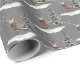Watercolor design of a big buck deer and pine trees in snow on grey background.