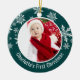 Snow Flakes Frame Baby's First Christmas Photo Ceramic Ornament. Baby's 1st Christmas custom photo custom name ceramic ornament in Dark Teal with white snowflakes frame around it, this makes a nice keepsake for your family to celebrate your newborn baby girl or baby boy's first Christmas holiday.