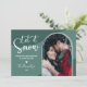 Elegant green christmas holiday card featuring your photo in the shape of a snow globe, with a wintery snow effect, the festive saying "let it snow", seasons greetings, your name, and the year.