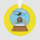 An illustration of a cute snow globe with blackbird singing on the top of a holly bird house hanging on a barebranch with colourful christmas balls in a snowy landscape and pine trees. This cute cartoon bird design is a gift idea for Christmas or xmas lovers and winter holiday lovers.
