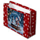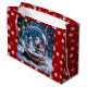 A Christmas gift bag with a beautiful snow globe with Santa Clause, Reindeer and a Christmas tree.