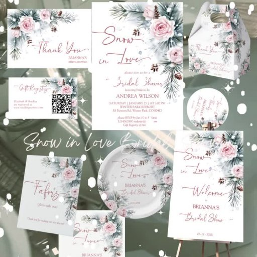 Snow in love winter bridal shower personalised paper plates template, watercolor dusty pink winter blush pink roses on snowy pines branches with pine cones snowflakes winter bridal shower monogrammed paper plates winter bridal shower printed napkins personalised bridal shower table decor