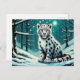 A snow leopard with snowy forest night background postcard. Easily customise the message for your needs.