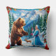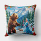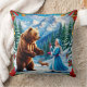 A magical winter landscape featuring a Snow Maiden dressed in a blue gown interacting with a beer. Snow-covered mountains and festive decorations enhance the seasonal and peaceful atmosphere.