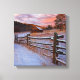 This photo features a snow covered rustic barn in front of a beautiful sunset on a Colorado ranch.