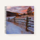 This photo features a snow covered rustic barn in front of a beautiful sunset on a Colorado ranch.