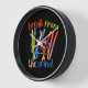 A clock featuring the phrase "Break from the Grind" in bold letters, accompanied by a graphic of snow skiers enjoying a ride up a ski lift, symbolising a winter escape and the thrill of outdoor adventure.