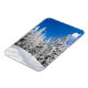 Vertical photo magnet of snow on the trees under a blue sky in a ski resort area in winter on a clear sunny winter day.