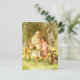 Vintage children's book illustration from the classic fairy tale, "Snow-White and Rose-Red". Both sisters are so fond of each other that they always walk hand in hand. They are alone in the forest, fearless of any beasts. The little hare is eating leaves right out of Rose-Red's hands, and a roe deer is poking around in Snow-White's basket. Such a happy and peaceful scene! Illustration by Hermann Vogel, 1893