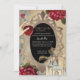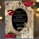 This magical and enchanting party invitation features a Snow White fairy tale theme. A golden magic mirror is placed across the front, with the text in the centre. The classic Once upon a time fairytale phrase is printed at the top in a whimsical gold font. A beautiful princess castle is placed in the bottom right, and an image of Snow White's hand holding a poisonous apple is printed in the top left. Red roses accent the borders of the invitation. The background is a rustic parchment paper design that resembles an old storybook.