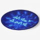 A swarm of blue fractal snowflakes. Inuktitut text reading "Kuvianak Innovia" (ᑯᕕᐊᓇᒃ+ᐃᓄᕕᐊ - Merry Christmas), in the syllabic alphabet adopted in Nunavut, also appears in glowing blue and white.