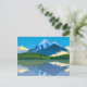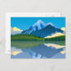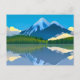 Postcard in a digital painting of snow-capped mountains and pine forest, reflected in a lake, under a deep blue sky