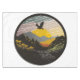 A sticker with an eagle flying over a mountain, in the style of contemporary landscape, golden light, black mountain college, fisheye lens, arts and crafts movement, mid-century illustration