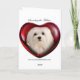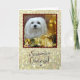 This cute Christmas Card features Snowdrop, a sweet little Maltese Dog. She is sitting behind some Christmas presents and decorations with some bright lights in bokeh beside her.