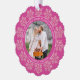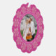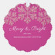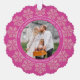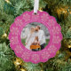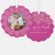 Personalised Christmas photo ornament cards are a festive way to send holiday greetings and this dark berry pink and faux glitter snowflake design is so easy to customise and make your own. Each ornament card has a hole punched at the top so your family and friends can hang your Christmas cards on their tree, the mantle or perhaps in a window. This elegant design begins with a circular border of tiny pink faux sparkle snowflakes around the edge with your personalised text and family photo in the centre. Two sets of curving white text can be edited to add your short Christmas greeting and names plus the year. Simply add your photo using the simple template and watch it turn into a round picture bordered in deep pink with a white edge. These personalised scallop shaped ornament cards reverse to reveal the same deep magenta pink background with a sprinkle of larger faux glitter snowflakes at the top, Merry & Bright in the centre in a pretty white script font and smaller simpler text just below where you can add additional wording such as your individual names. Create your own custom Christmas photo ornament cards with this eye catching raspberry pink and bling snowflake design to delight everyone with Christmas cards they can hang and display for a little extra holiday cheer this year.