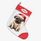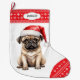 An adorable little Pug dog wears a red and white Santa hat on the front of this Christmas stocking. The image is placed on a white background, and the toe and top border are a red and white snowflake pattern. On the top border is a white label with your custom text in dark grey. The back of the stocking has the same red and white snowflake pattern.
