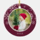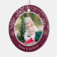 Festive photo Christmas ornament features a favourite photo on each side, framed by white snowflakes on vibrant jewel toned burgundy plum. Personalise with a custom caption on each side; shown with names and the year.