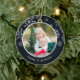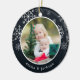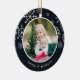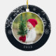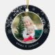 Festive photo Christmas ornament features a favourite photo on each side, framed by white snowflakes on crisp contrasting black. Personalise with a custom caption on each side; shown with names and the year.