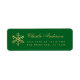 An elegant green and gold return address label, recommended for the winter holidays greeting card. It has a faux gold foil snowflake on the left and golden text on the right. The name is written in an elegant Calligraphy, the address in smaller caps. It can be used for a Christmas or a New Year greeting card. The background is forest green.