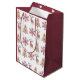 A maroon deer, snowflake, and Holiday tree alternate in the pattern on the front and back of this Christmas gift bag. The images are placed on a white background. The sides of the bag are matching maroon. This gift bag matches our Most Wonderful Time Woodland gift packaging line. See our store for the matching products!