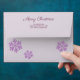 Perfect for your custom Christmas cards and invitations, these lavender purple envelopes designed with faux glitter purple snowflakes are easy to personalise with your name and address details. The back flap has two simple text templates in deep plum purple fonts. Your return address in a block style font can be printed on each Christmas envelope, but you can also choose to erase the placeholder text if you prefer. Right above, in a pretty script font, is Merry Christmas which can be changed to Happy Holidays or Merry and Bright or can be removed if you wish. The inside envelope lining is a pattern of purple snowflakes on a deep rich amethyst purple background while three faux glitter purple snowflakes decorate the back and a single snowflake on the lower left of the front of these personalised envelopes set the wintery mood for mailing cards, invitations to parties and brunches and even non-Christmas events. Have a winter birthday event to plan for? These snowflake envelopes in pastel purple outside and dark plum purple inside will add some fun to the invitation!
