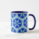 Coffee mug in a geometric, honeycomb quilt pattern of snowflakes in deep cobalt blue and white, accented with turquoise