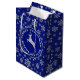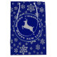 This pretty holiday gift bag features a silver faux glitter snowflake pattern on dark blue background. The matching dark blue centre has a faux glitter reindeer image in the centre of curved text that says Merry Christmas and Happy New Year. The back of the bag has the same snowflake on blue background and centre, but in place of the deer is your custom text. *Please note - the image is printed and contains no actual glitter.