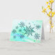 Blue and teal snowflakes riding on a turquoise and green swirly winter breeze. Set on a white background. Fun and delicate design.