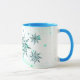 Blue and silver snowflakes riding on a turquoise and blue swirly winter breeze. Set on a white background. Fun and delicate design.