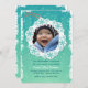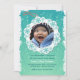 A unique photo card to celebrate a winter birthday. The grunge, teal, snowy background features a snowflake-tag photo-window for your favourite photo. Perfect for any age or gender.