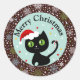 The vairous snow flake shapes are in lime, teal and white with the same colours dots and stars in the very dark chocolate brown background. The black cat in the centre with a santa hat and a candy cane on its tale. The red, white and gold stars in the teal background. This is a digital illustration.