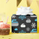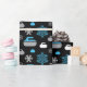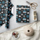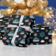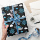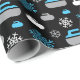 Wrapping paper featuring a snowflake and curling rock pattern in blue, white and grey on black background. Perfect for curlers and curling fans.