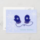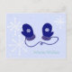 A cute design for the winter weather. A soft blue background with white snowflakes floating about. The words winter wishes in soft blue. A royal blue pair of mittens with a snowflake design in the centre.