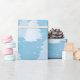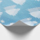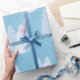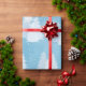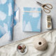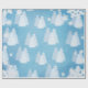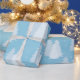 Pretty holiday or winter wrapping paper features lots of beautiful white snow covered trees and white snowflakes on a sky blue background.