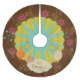 Snowflakes and Starburst Christmas holiday tree skirt, a beautiful retro style design featuring a background of brown with colourful snowflakes of yellow, pink, aqua, and orange, white polka dots on mustard green, and an aqua starburst with four pretty retro style ornaments and a cream coloured banner you can personalise with your family name!