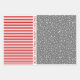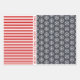 Snowflakes, Christmas trees and stripes red and grey Wrapping Paper Sheets with red Christmas wishes. One sheet displays a cute pattern of snowflakes in dark grey and stripesin red and white. The second features snow and the third white trees on different shades of grey. There also is the text "Merry Christmas" in red on all sheets. Personalise it with your text.