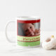Merry Christmas Grandpa custom photo mug in stylish shades of green and red in a delicate white snowflake pattern with customisable text and photo, perfect as a holiday gift.