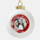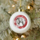 Personalised Holiday ornament with modern design featuring winter white snowflakes on red and personalised round photo. A beautiful Christmas tree ornament for your family or a keepsake for your first Christmas together!